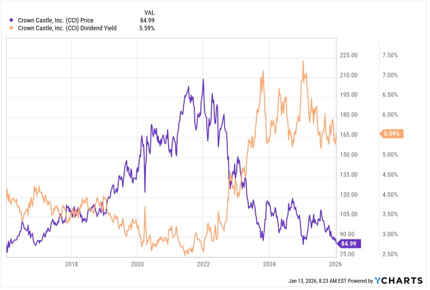 Some of my subscribers have wanted my thoughts on Crown Castle (CCI) for awhile. No wonder, with their dividend yield having climbed above 5% as the stock price dropped nearly 3x: