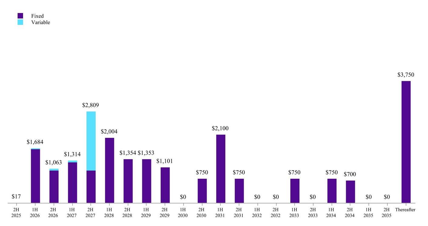 Here are numbers based on current debt; debt will decrease after their asset sale: If long rates stay near where they are, Crown Castle would see interest expense increases in the ballpark of $30M in 2026, $8M in 2027, and $60M in 2031. Compare that to the current annual expense of about $900M. Pro-forma CfO will be near $2B, so this ballpark would look like a headwind to growth of 1.5% in 2026, much less in 2027, and 3% in 2031.